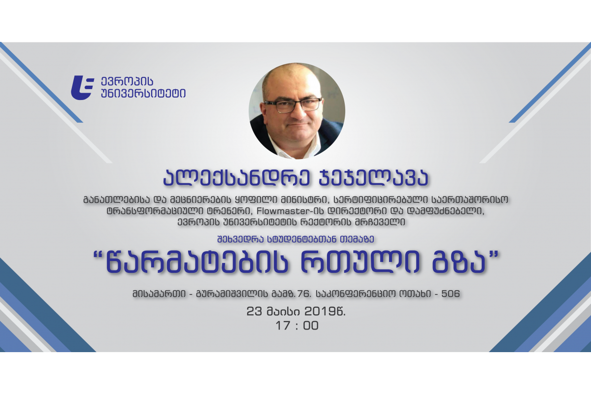 23 მაისს, 17:00-დან 19:00 საათამდე, ევროპის უნივერსიტეტში განათლებისა და მეცნიერების ყოფილი მინისტრი, სერტიფიცირებული საერთაშორისო ტრანსფორმაციული ტრენერი, Flowmaster-ის დირექტორი და დამფუძნებელი და ევროპის უნივერსიტეტის რექტორის მრჩეველი, ბატონი ალექსანდრე ჯეჯელავა შეხვედრას გამართავს სტუდენტებთან შემდეგ თემაზე:
