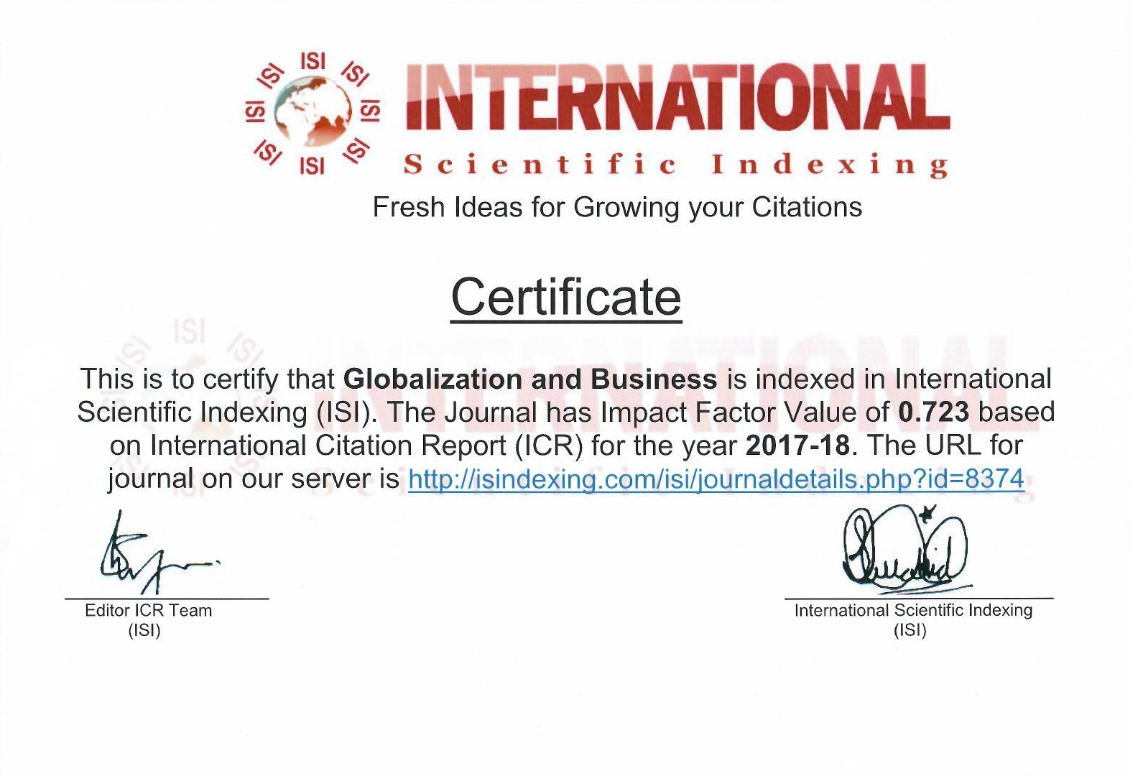 ევროპის უნივერსიტეტის გლობალიზაციის ეკონომიკური და სოციალური პრობლემების კვლევითი ინსტიტუტის მიერ ბიზნესის და ტექნოლოგიების ფაკულტეტთან ერთად გამოცემულ ჟურნალს - გლობალიზაცია და ბიზნესი (Globalization and Business) - უკვე მინიჭებული აქვს იმპაქტ ფაქტორი ორი ცნობილი საერთაშორისო ბაზის მიერ: